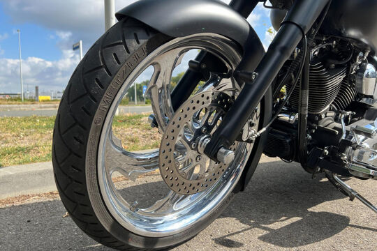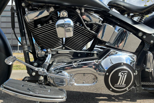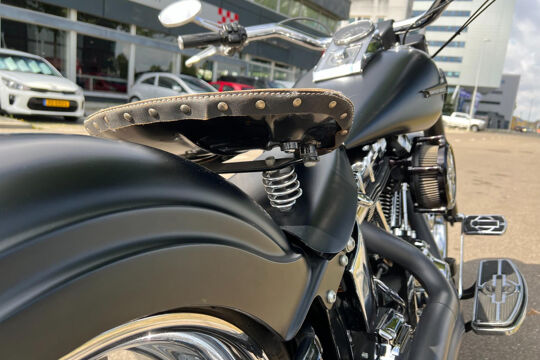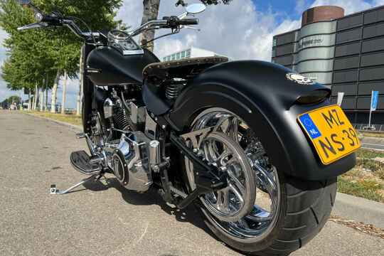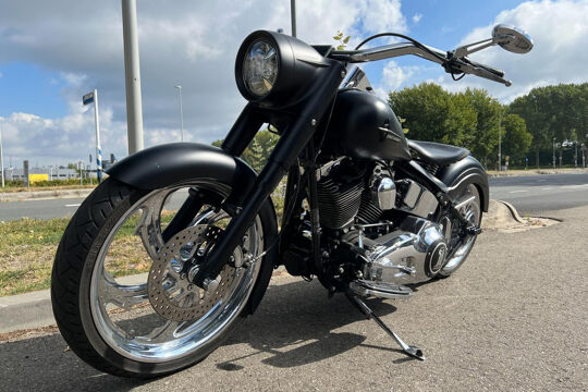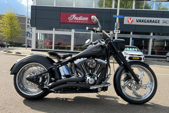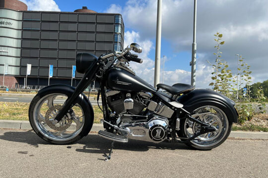 Super dikke omgebouwde customized Fatboy Anniversary . solo uitgevoerd met lederen zweefzadel. Stretched tank met verzonken Skull-tankdoppen. De motor is verbouwd bij South-East Motorcycles. Een Super bike om te zien en mee te rijden.