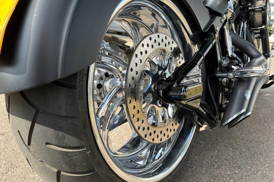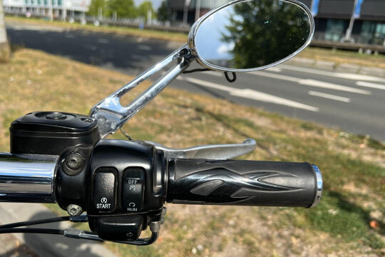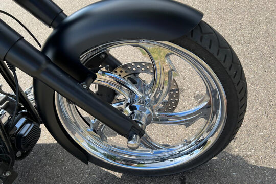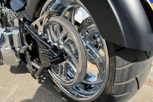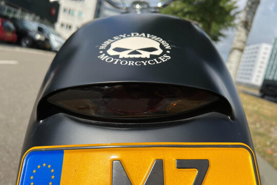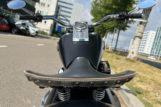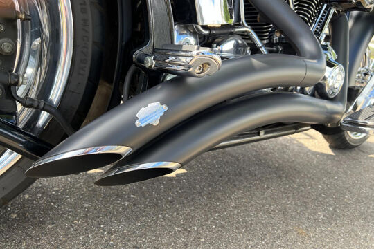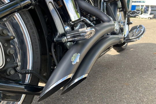 De gemonteerde Vanche &Hines ''Big Radius'' uitlaat geeft de motor net dat stukje meer karakter als aanvulling op het geheel.
