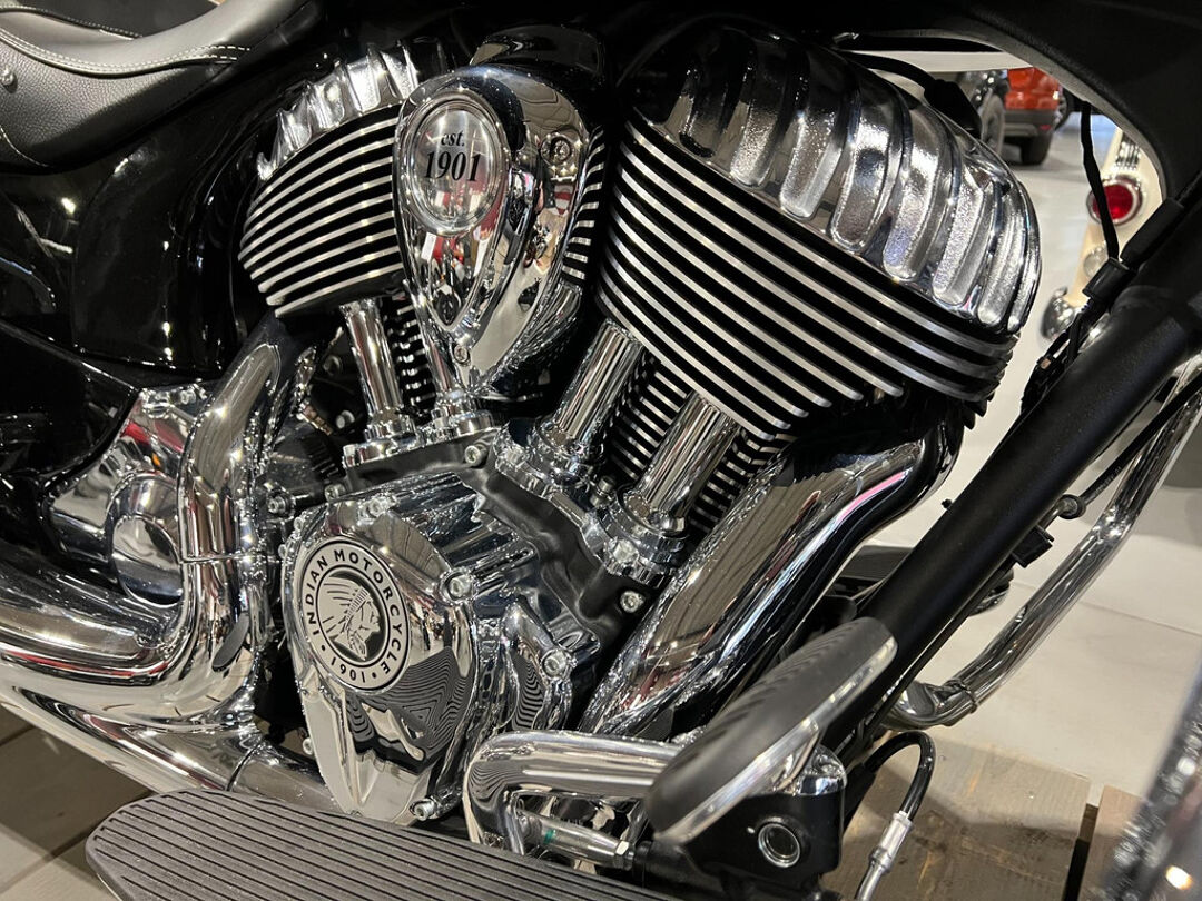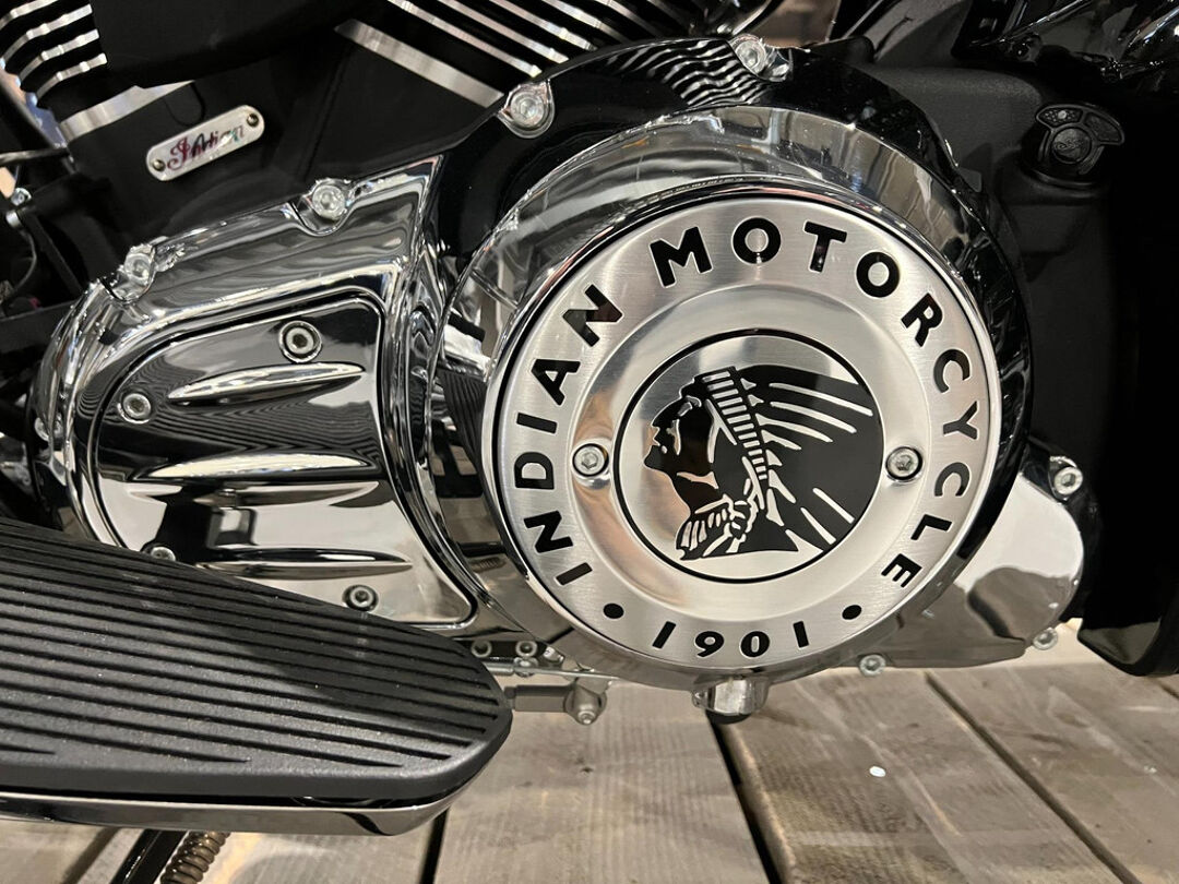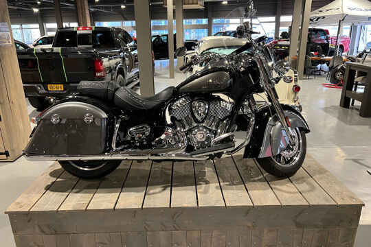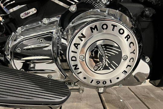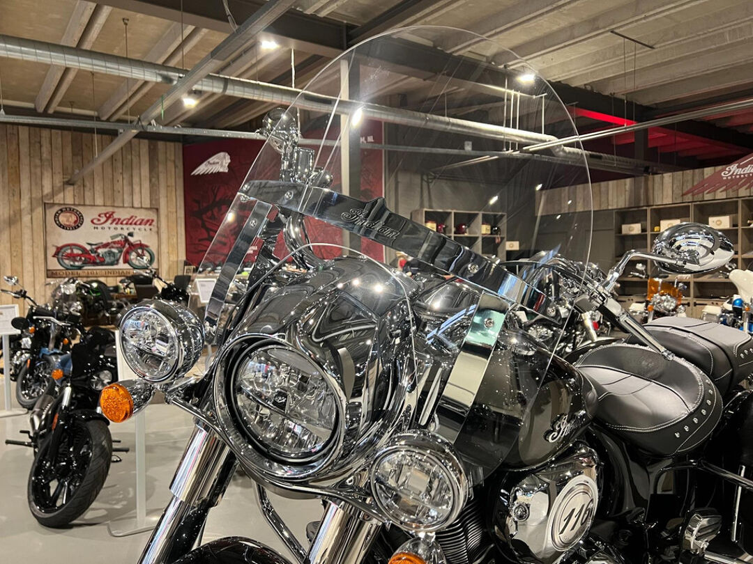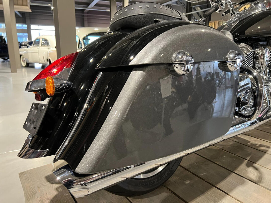 Snel ontgrendelbaar windscherm, zadel in vinyl, op afstand afsluitbare, harde zadeltassen, highway bars, bandenspanningscontrole, lichtstang, ABS, snelheidsregelaar, sleutelloos starten, Indian®-opschrift op de tank