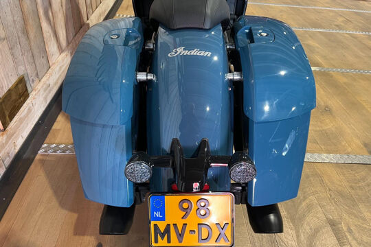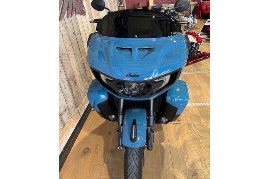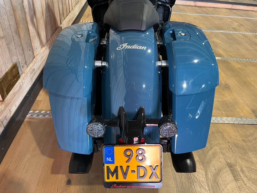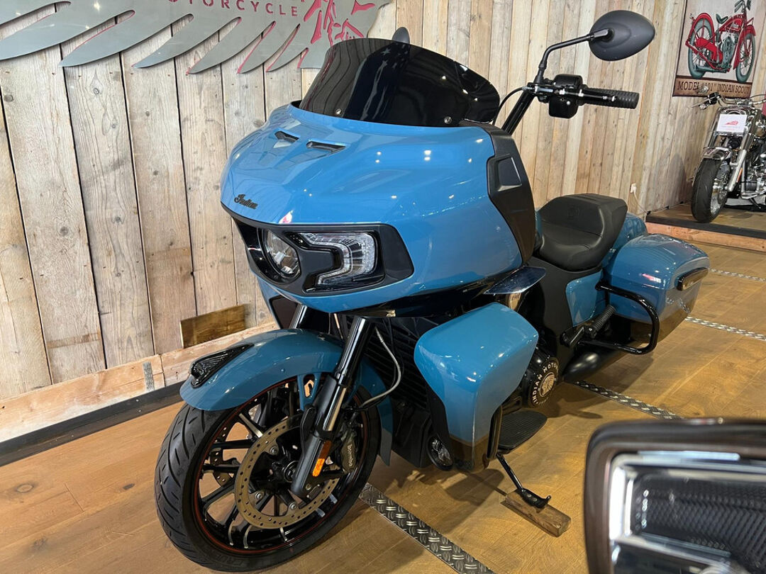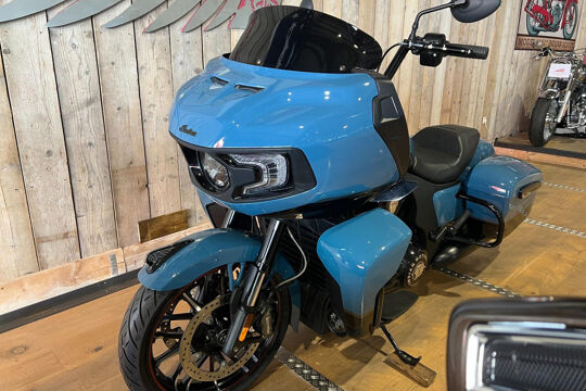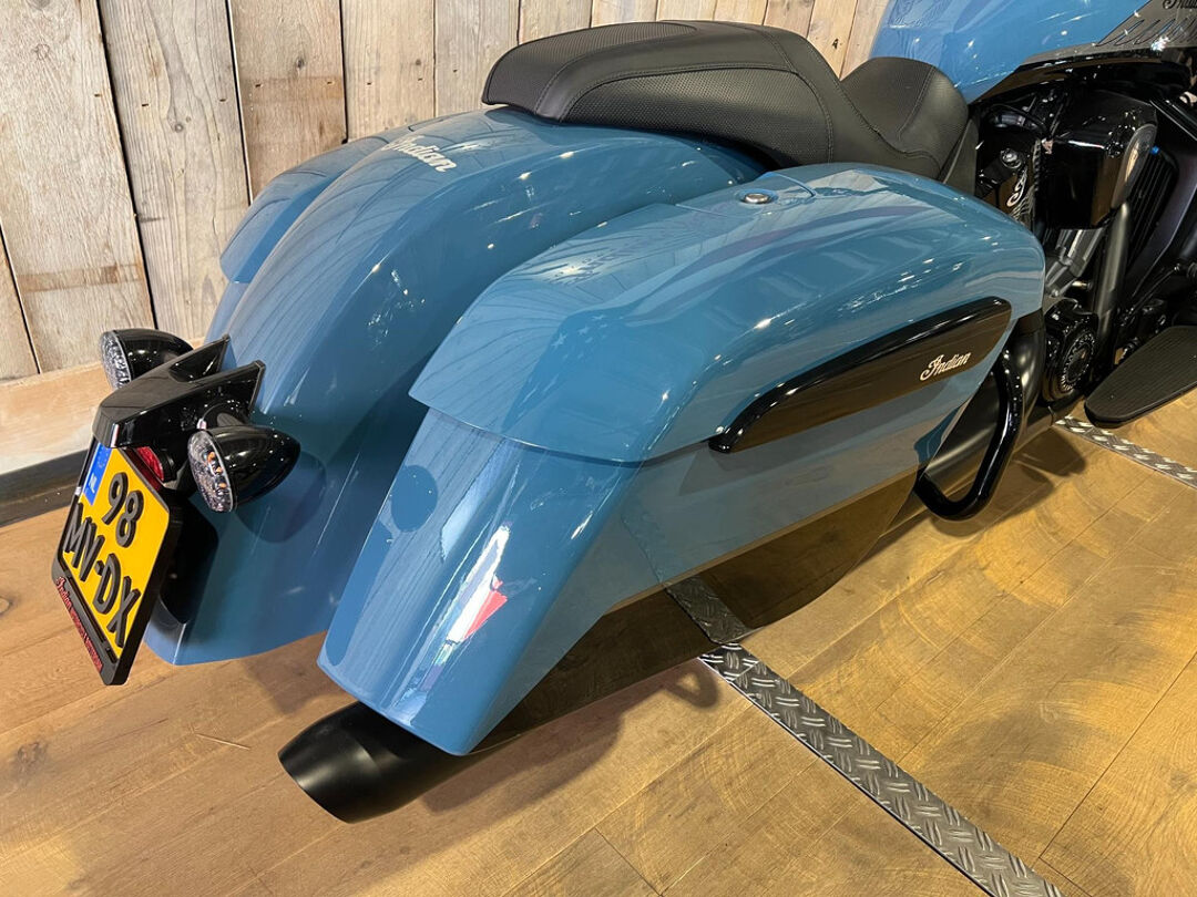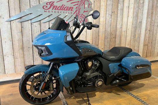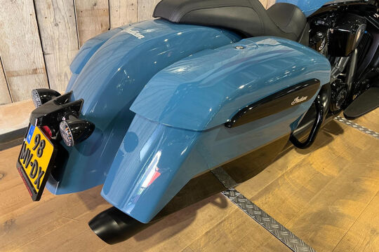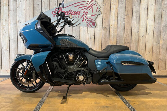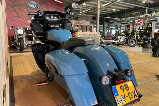 Een topper onder de Baggers ! deze schitterende CHALLENGER DARK HORSE is in de kleur Storm Blue / Black Metallic . DE Challenger staat er perfect bij en heeft een aantal extra's zoals een afneembare topkoffer , verhoogd stuur (Mitered Handlebar black) , , smoke windshield , beenkappen in kleur en voorzien van Low beams.