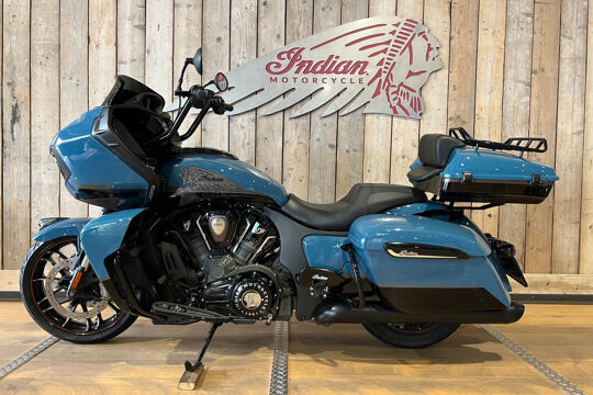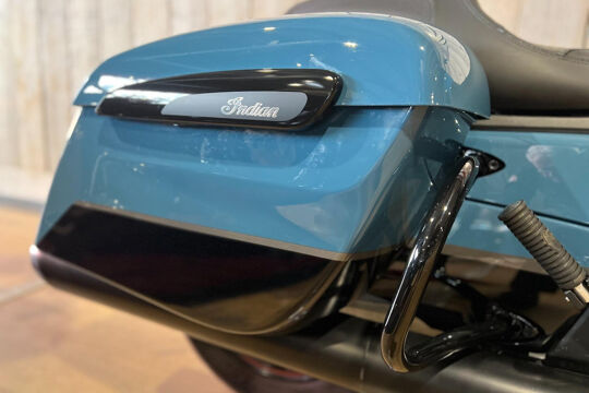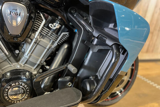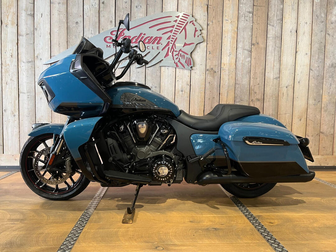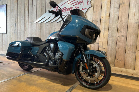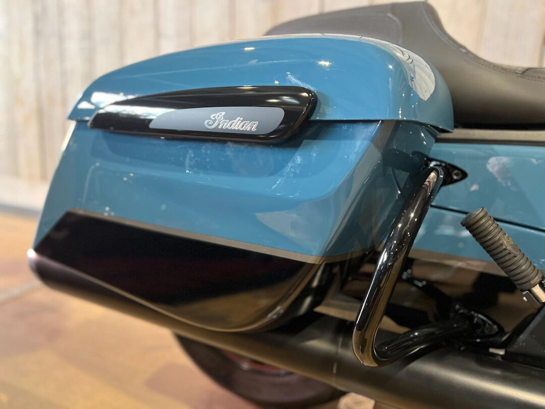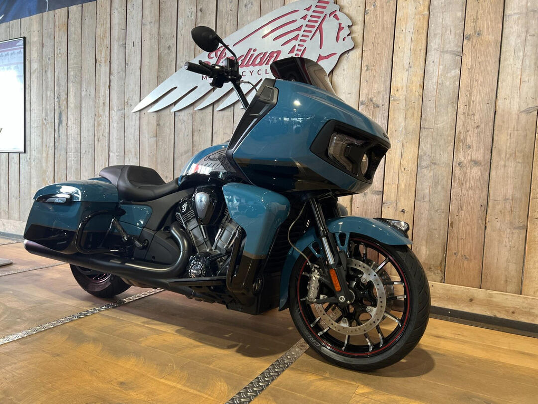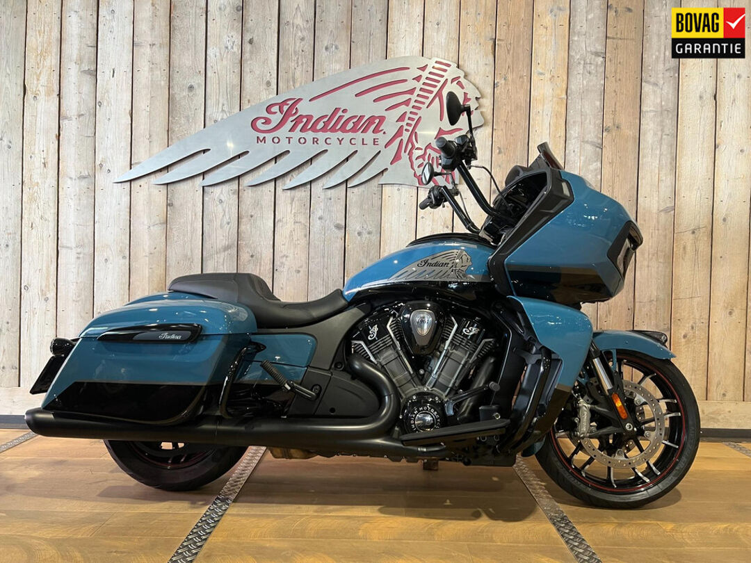 Een topper onder de Baggers ! deze schitterende CHALLENGER DARK HORSE is in de kleur Storm Blue / Black Metallic . DE Challenger staat er perfect bij en heeft een aantal extra's zoals een afneembare topkoffer , verhoogd stuur (Mitered Handlebar black) , , smoke windshield , beenkappen in kleur en voorzien van Low beams.