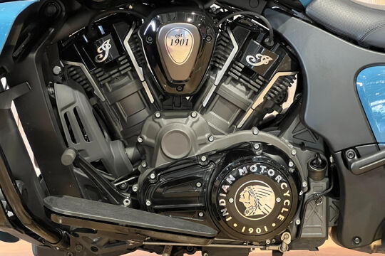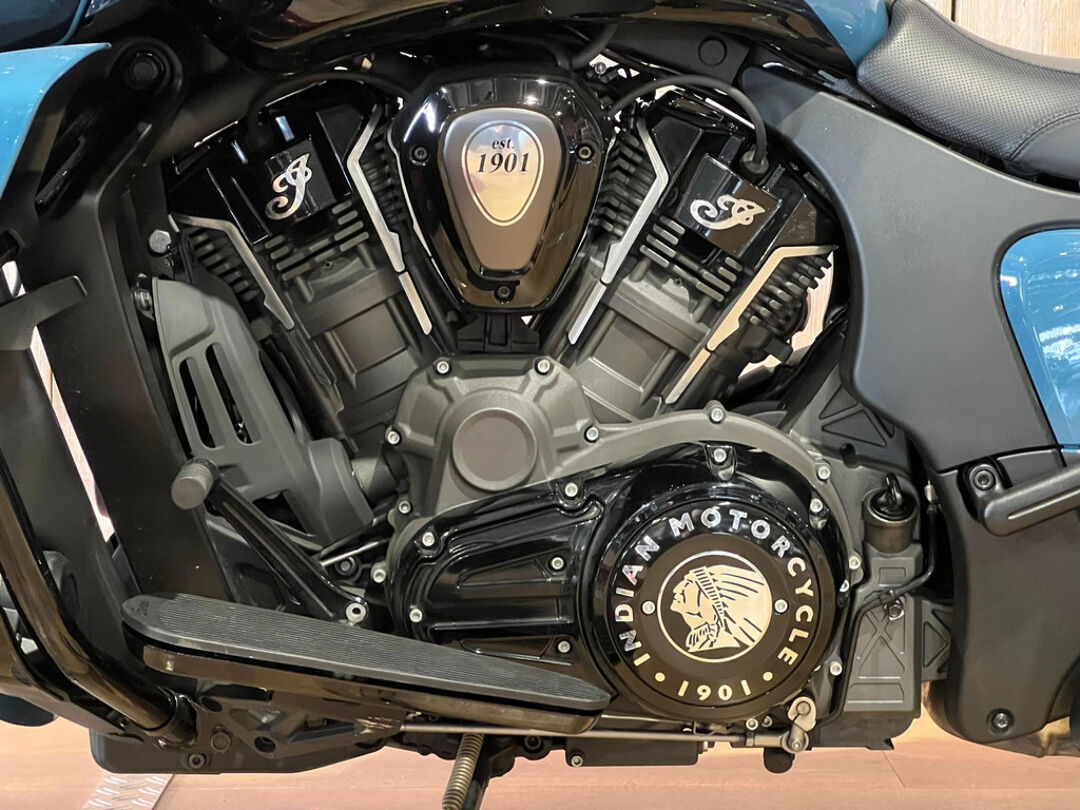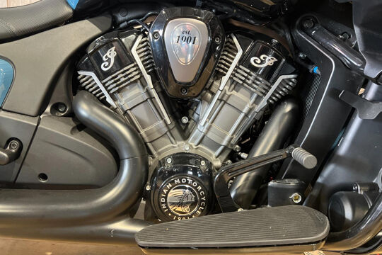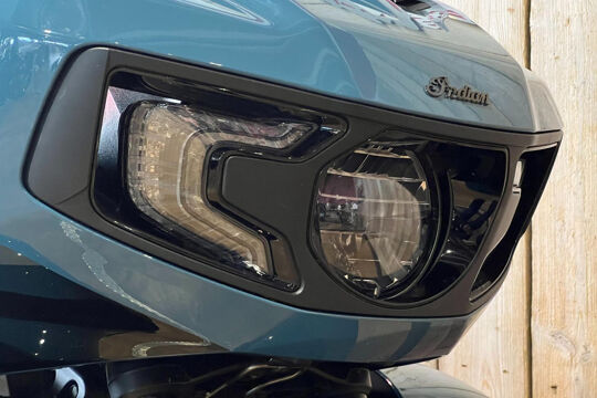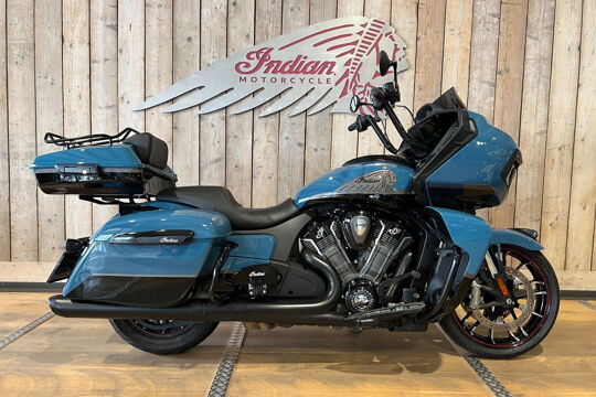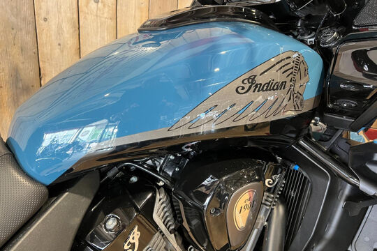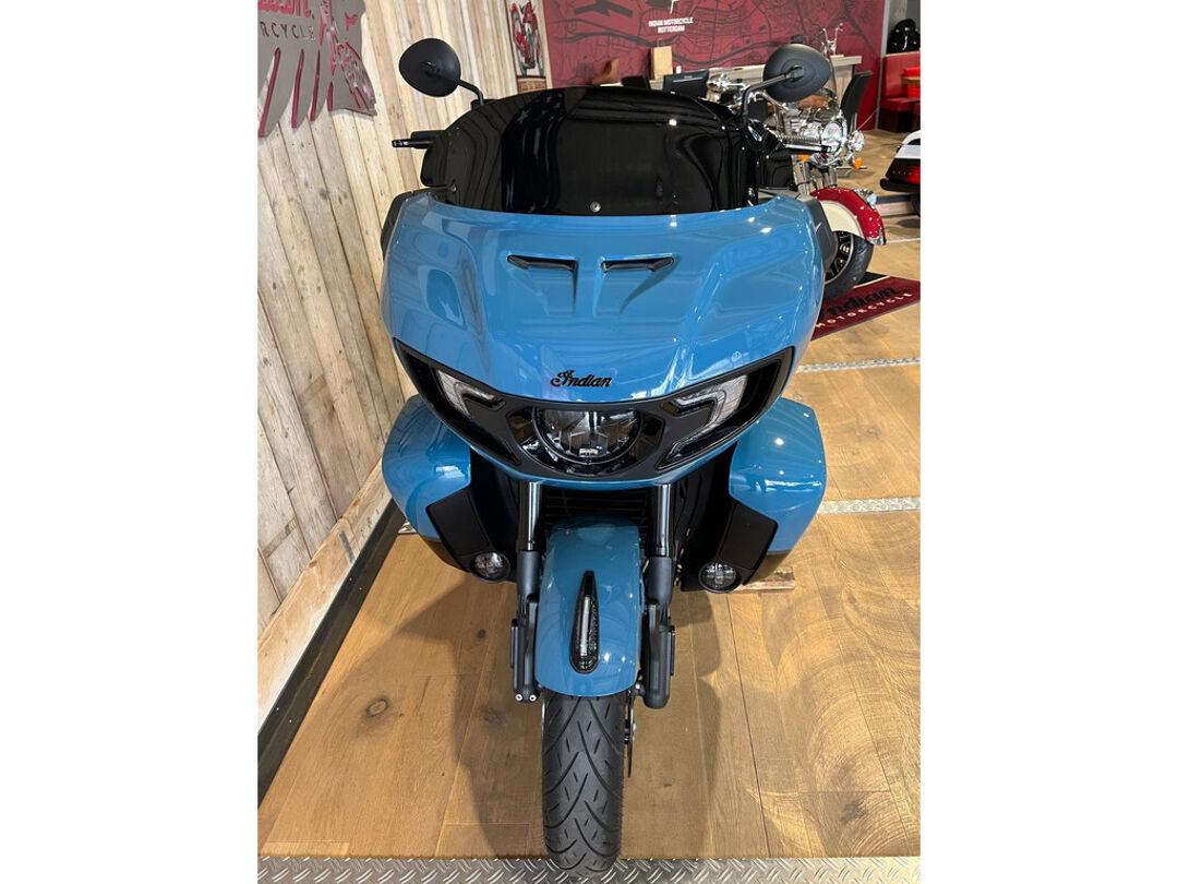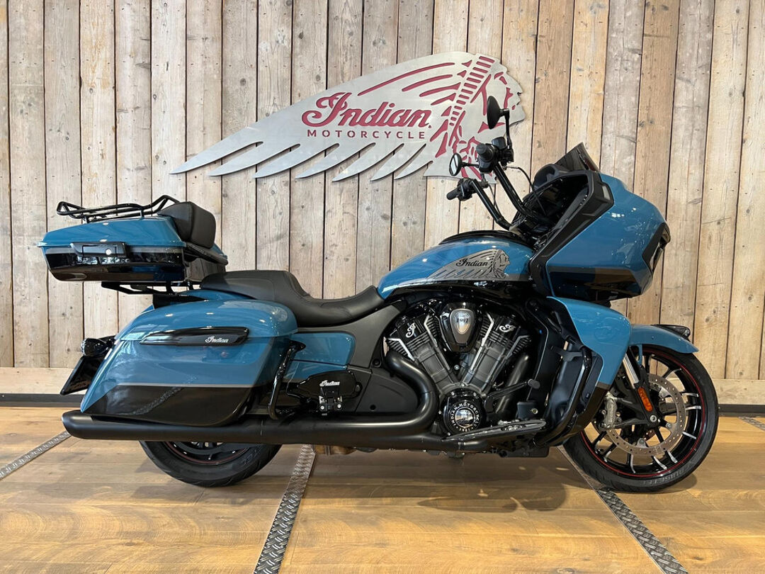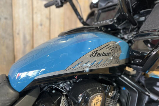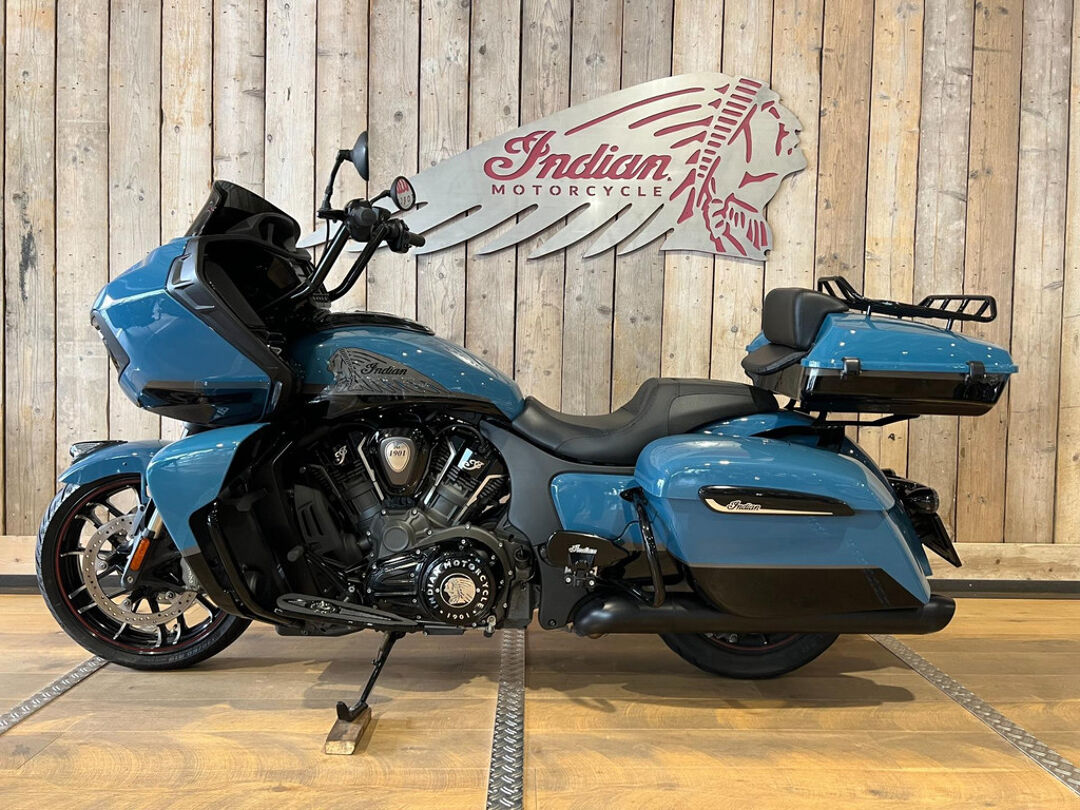 Een topper onder de Baggers ! deze schitterende CHALLENGER DARK HORSE is in de kleur Storm Blue / Black Metallic . DE Challenger staat er perfect bij en heeft een aantal extra's zoals een afneembare topkoffer , verhoogd stuur (Mitered Handlebar black) , , smoke windshield , beenkappen in kleur en voorzien van Low beams.
